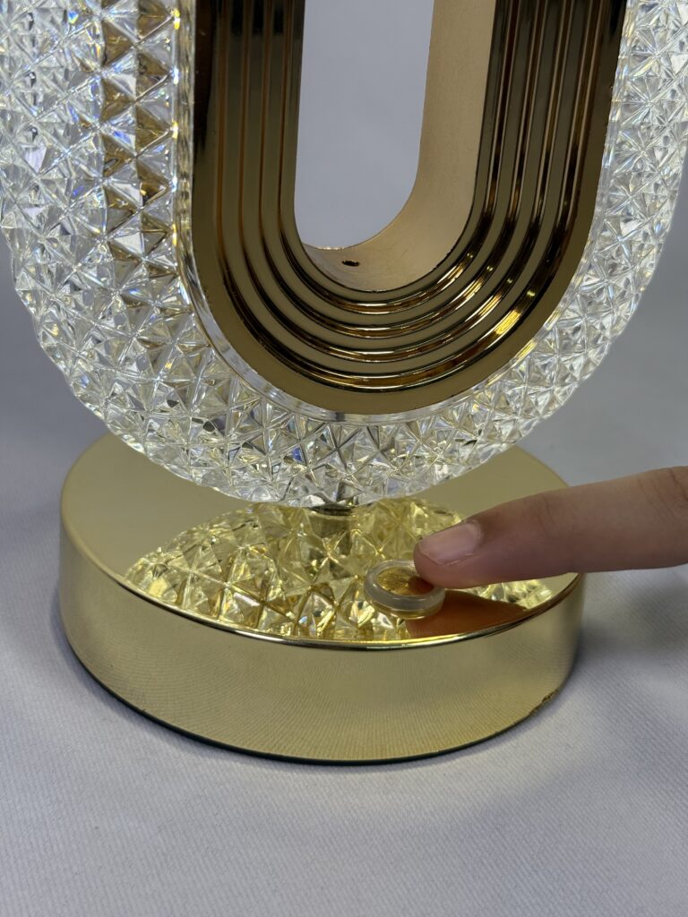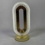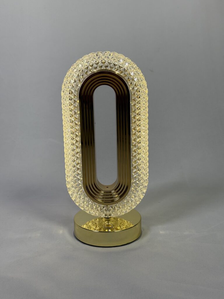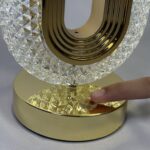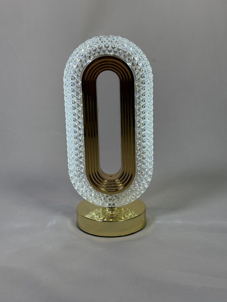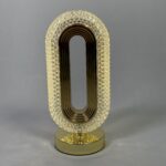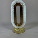 This elegant lamp features a sleek, oval-shaped design with a gold-toned interior and a crystal-encrusted exterior, creating a sophisticated ambiance. The lamp is touch-activated, allowing for easy control over its illumination. Its gold base adds a touch of luxury, making it a perfect addition to any modern or contemporary space. The lamp’s crystal exterior refracts light, casting a warm glow and adding to its decorative appeal.